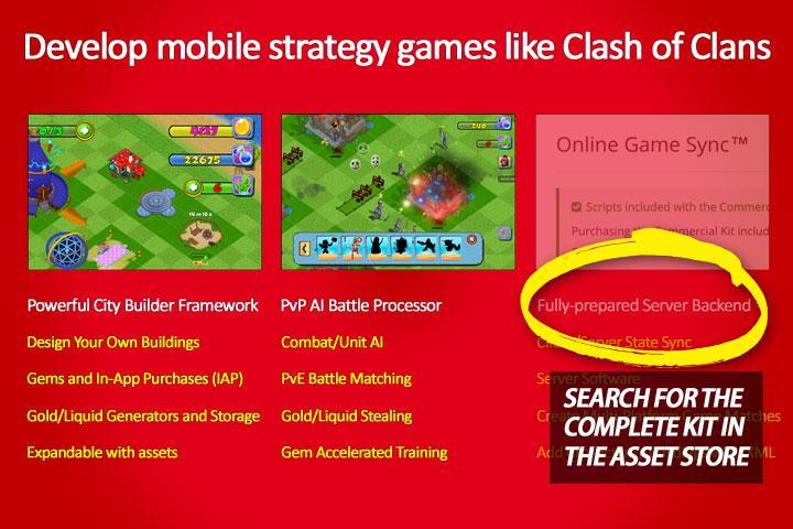 Un juego de demo con el kit de juegos de construcción de la ciudad para Unity. Con este kit de juegos puedes desarrollar juegos de estrategia móvil y librar una guerra contra otras aldeas de jugadores. Gana el botín y destruye bases en esta demostración del juego de fantasía.